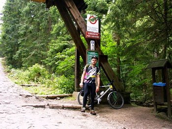 W dalszą drogę powiodła nas „szutrówka”. Zrobiliśmy sobie jeszcze małą przerwę na obejrzenie starego bunkra, w którym nie znaleźliśmy nic ciekawego. Później zjazd do Szklarskiej Poręby i nocleg na polu namiotowym, położonym dosyć wysoko ponad centrum miejscowości. Wcześniej udałem się jeszcze w poszukiwaniu alternatywnego noclegu. Zrobiłem rowerową rundkę po okolicy, wspiąłem się, żeby zobaczyć słynny Zakręt Śmierci i stamtąd zjechałem ścieżką, która prowadziła do sztolni. Zwiedzanie ich odbywa się „na dziko”. Od przemiłej pani pracującej na parkingu przed Zakrętem Śmierci (jadąc do Szklarskiej Poręby) dowiedziałem się, że jedna ze sztolni jest długa, druga zaś liczy trzy sale, ale do zwiedzania potrzebna jest drabinka i dobre oświetlenie, wtedy ściany mienią się przepięknymi barwami minerałów. Porozmawialiśmy nieco dłużej, dowiedziałem się wielu interesujących faktów dotyczących historii i topografii Sudetów i okolic Szklarskiej Poręby. Nazajutrz planowaliśmy wyjazd na Szrenicę, pani powiedziała, że ze szczytu poprowadzona jest granią „autostrada” dla rowerów, w kierunku, w którym chcieliśmy podążać. Bardzo mnie to ucieszyło. Doradziła również którędy najlepiej dojechać pod wodospad Kamieńczyka. Wróciłem na pole namiotowe. Po prysznicu i kolacji poszedłem spać. Mój licznik pokazywał 48 km. Dzień 5 Nareszcie ładnie i dużo cieplej. W dobrych nastrojach zjechaliśmy do Szklarskiej Poręby na zakupy. Codziennie robiliśmy zakupy, zwykle przed wyruszeniem w drogę i wieczorem, tuż przed noclegiem. Trzeba było zaopatrzyć się w wodę, batony, drożdżówki, pod koniec dnia pomyśleć o kolacji i ewentualnie również o śniadaniu. Ze Szklarskiej Poręby wyjechaliśmy asfaltem, minęliśmy dwa parkingi, z których prowadzą wyjścia pod wodospad i pojechaliśmy nieco dalej. Skręciliśmy w asfaltową drogę prowadzącą do lasu. Zgodnie z informacjami uzyskanymi dzień wcześniej dojechaliśmy dobrą, asfaltową drogą pod sam wodospad Kamieńczyka. Jest prześliczny, potok płynie przez wąski, głęboki wąwóz, o pionowych ścianach. Wodospad Kamieńczyka jest uważany za jedną z największych atrakcji turystycznych Polski. Tutaj zaczyna się Karkonoski Park Narodowy (KPN). Kupiliśmy bilety i pojechaliśmy w górę. Na terenie KPN obowiązuje zakaz poruszania się na rowerach, za wyjątkiem dróg rowerowych. Na Szrenicę prowadzi jedna z nich. Prawie cały podjazd (oprócz początkowego odcinka) udało mi się pokonać jadąc. Mimo że nawierzchnia na długim odcinku jest niezła (płyty betonowe), podjazd jest bardzo trudny ze względu na nachylenie, szczególnie, gdy trzeba targać ze sobą „dom” z wyposażeniem. Chwilami miałem ochotę dać sobie spokój z jazdą. Po drodze wyprzedzaliśmy sapiących pieszych turystów, którzy z nieukrywanym podziwem spoglądali w naszą stronę. Po chwili odpoczynku udaliśmy się na Szrenicę. Na górze porozmawiałem dłuższą chwilę ze spotkanymi turystami, bardzo zaciekawiła ich nasza wyprawa i chcieli dowiedzieć się szczegółów.