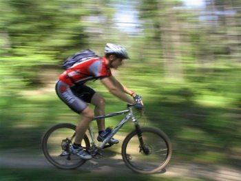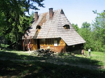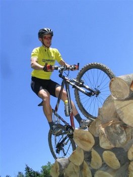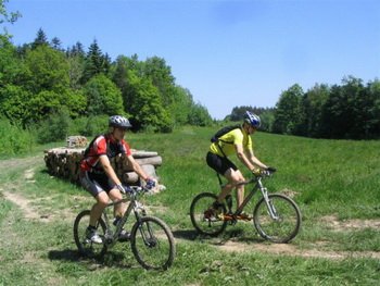 Choć droga wiedzie cały czas lasem to w miarę jak zyskujemy wysokość w przerwach między zaroślami pojawiają się nam coraz ciekawsze widoki. Najpierw były to pola w dolinach a teraz już można obserwować całą okolicę. Chwilę jedziemy lasem, aby po chwili wydostać się na obszerną polanę, u wylotu której napotykamy równo poukładane, ścięte drzewo. Jak na rowerowych świrów przystało trzeba zrobić kilka zdjęć niekoniecznie poważnych. Piotrek nie wytrzymuje w końcu i dzielnie wskakuje na drewniane sągi. Kilka podskoków i już jest na dole. Tak, nic dziwnego, że potem ramy pękają... Mobster Piotrka na szczęście znosi katusze dzielnie i ruszamy z wolna pod górkę przez las. Szlak prowadzi nieco na prawo, ale nie wygląda zachęcająco, toteż jedziemy drogą po jego lewej stronie. Tu jest przynajmniej szeroko, choć stromiej i wspinaczka idzie wolniej. Dojeżdżamy do leśnego skrzyżowania gdzie najwyraźniej ciężki sprzęt leśników zrobił swoje. Udaje nam się jednak przecisnąć przez ścięte gałęzie i koleiny, po czym wyjeżdżamy w lewo na szeroką i równą drogę. Szlaku na razie nie widać, ale w momencie gdy wtrącam słówko na temat ewentualnego zagubienia Kuba zauważa żółte znaczki wychodzące z lewej strony. Jeszcze chwila i lądujemy na Przełęczy Żdżar w okolicy Bartniej Góry. W tej chwili znajdujemy się na wysokości około 580m npm. co daje nam różnicę 300m względem punktu, z którego wyruszyliśmy. Przejechaliśmy mniej więcej 12km. Tutaj chwila odpoczynku, rzut oka na drogowskazy i poglądową mapkę szlaków oraz czas na małą przekąskę. Aby kontynuować jazdę w kierunku Przełęczy Małastowskiej wracamy kawałek do zielonego szlaku odbijającego w lewo. Pierwsze co rzuca mi się w oczy to siedzący na gałęzi pobliskiego drzewa jastrząb. Niewielka liczba tych drapieżnych ptaków zamieszkuje te okolice i przy odrobinie szczęścia można je spotkać. Ptaszysko najwyraźniej nie było zachwycone moim widokiem, bo czym prędzej odleciało. Kuba z Piotrkiem nie zdążyli go nawet zobaczyć... za to zdążyli zapytać co brałem przed wyjazdem, że jastrzębie widzę :) Dalej las zmienia swój charakter, dookoła widać efekty tegorocznych wichur, które przetrzebiły drzewostan wielu pasm górskich. Na szlaku pojawiają się wypełnione wodą oczka, zarośnięte glonami, co świadczy o tym, że utrzymują się tutaj przez cały czas. Z ich ominięciem nie ma problemu i suchym kołem przejeżdżamy dalej. Kierujemy się na Sołtysią Górę a następnie na Wierch, który ma już około 700m npm. Cały czas jest szeroko i można śmiało jechać jeden obok drugiego. Czasem drogę zagrodzi jakieś zwalone drzewo lub napotkamy grząski grunt, jednak wszystkie te przeszkody omijamy doskonale bokiem, gdzie inni bikerzy przetarli przejazdy przed nami. W tej okolicy napotykamy kilkanaście osób na bardzo zwyczajnych „góralach” z supermarketu, co pozwala sądzić, że dalsza część trasy nie jest ani trudna technicznie ani zbyt wymagająca kondycyjnie. W drodze do schroniska na Magurze Małastowskiej czeka nas jeszcze długi, ale niezbyt ostry podjazd na sam szczyt Magury Małastowskiej (814m npm.) – najwyższego wzniesienia grzbietu, którym jedziemy. Wierzchołek mijamy właściwie go nie zauważając i dopiero, gdy po lewej stronie pojawiają się zabudowania wyciągu narciarskiego orientujemy się w sytuacji. Na myśl przychodzą zeszłoroczne szaleństwa na nartach, ale dzisiaj nie czas na deskę i biały puch. Dzisiaj czas zedrzeć jeszcze znaczną ilość bieżnika z naszych opon i wzbić porządny tuman kurzu na szutrowym zjeździe do przełęczy. Zanim jednak ruszymy dalej trzeba dać sobie odpocząć przy schronisku. W tym miejscu krzyżują się szlaki zielony, żółty i niebieski. Nas interesuje ten ostatni, jako, że musimy dostać się do miejscowości Banica i dalej do Bartnego. Dalszy bieg wycieczki będzie uzależniony od tego, o której godzinie się znajdziemy w bacówce PTTK w Bartnem. Szlak zielony, którym podążaliśmy do tej pory skręca w prawo w kierunku Wysowej Zdroju i Ostrego Wierchu. Żółty szlak również odbija w prawo i po 2-3 kilometrach odchodzi od zielonego, aby zaprowadzić nas przez Ujście Gorlickie w kierunku Klimkówki. Tam czeka nie lada atrakcja – jedno z najczystszych i najbardziej malowniczych sztucznych jezior w regionie. Niewielka ilość turystów oraz dziki charakter okolicy z niezbyt rozbudowaną infrastrukturą czyni z jeziora Klimkówka wspaniałe miejsce wypoczynku. Sam często tam spędzam kilka dni w roku pod namiotami z dala od codziennych spraw... Koniec rozważań nad okolicą, czas nacisnąć na hamulce! W przeciwnym razie skończyłbym pod kołami nadjeżdżającego samochodu. Samochód? Skąd? Aha, no tak, zanim się obejrzałem dojechaliśmy do Przełęczy Magurskiej. Prowadzi przez nią szosa nr 981 do przejścia granicznego w Koniecznej. Trasa również dobrze mi znana z kwietniowych zmagań na stupięćdziesięciokilometrowym II Rajdzie Kolarskim wokół Beskidu Niskiego. Na Przełęczy warto się na chwilę zatrzymać przy cmentarzu wojskowym z czasów I wojny światowej o oryginalnej architekturze. Jest to jedna z licznych pozostałości po linii frontu austryjacko - rosyjskiego z lat 1914-1915.