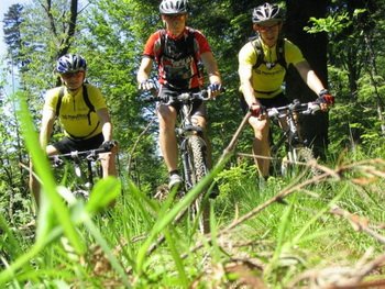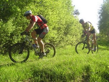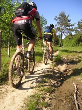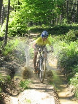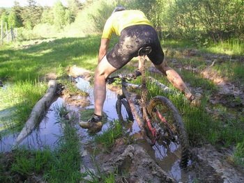 Zostalibyśmy dłużej, ale czerwony szlak domaga się kontynuowania wycieczki. Gdy pokonujemy pierwszy podjazd spotykamy znów kilku pieszych turystów patrzących na nas z niewytłumaczalnym zaskoczeniem w oczach. Ciekawe, co też jest dalej, że tak dziwnie na nas patrzą?? Najpierw zjazd, troszkę błotka... troszkę więcej błotka... krowy... i wreszcie główny punkt programu, z którego korzysta w pierwszej kolejności kto? Oczywiście Kuba! Jakie jest jego zdziwienie, gdy wpadając z impetem w pierwszą wielką kałużę jego rower zanurza się do połowy w wodzie! Kilka prób wyjechania z pułapki kończy się fiaskiem, więc wraz z Piotrkiem spieszymy z pomocą, aby wyciągnąć biednego NRS’a. Następne kilkaset metrów można śmiało uznać za największy „przekręt” wycieczki. Niczym bociany człapiemy po terenie podmokłym do tego stopnia, że zapadamy się ponad kostki. O jeździe po trawiastym, nasiąkniętym do granic dywanie można całkowicie zapomnieć. Daremne są wszelkie próby znalezienia suchego przejścia i po kilkunastu kąpielach buty mamy tak brudne i przemoczone, że przestajemy się wszystkim przejmować. Na takim brodzeniu mija nam kilka minut zanim wreszcie docieramy do miejsca, gdzie jest niewielki podjazd i grunt staje się suchy. Na chwilę wyjeżdżamy na otwartą przestrzeń, gdzie trawersem przecinamy niewielkie wzniesienie. Do lasu wjeżdżamy witani rykiem silnika wielkiego spychacza, który przygotował nam wspaniały, błotny tor przeszkód w postaci zmasakrowanej nawierzchni, połamanych gałęzi i kolein głębokich na pół metra. Przedostawszy się jakimś cudem dalej docieramy do kamienistego podjazdu oznajmiającego nam zbliżającą się Magurę Wątkowską – cel naszej wycieczki. Po drodze zawierusza się nam gdzieś Kuba. Zamiast skręcić na zielony szlak prowadzący do szczytu pojechał dalej czerwonym. Na szczęście po chwili zorientował się w sytuacji i już razem witani oklaskami kilku turystów mozolnie wtaczamy się pod kilkudziesięciometrowy zadzior na wierzchołek góry. Istotnie podjazd w końcówce ma ponad 25% i trzeba się już wykazać odrobiną wprawy, aby go pokonać. Ze szczytu można podziwiać wspaniały widok w kierunku zachodnim. Pozostałe strony świata zasłania gęsty las porastający cały masyw. Kończymy odpoczynek i ruszamy zielonym szlakiem w kierunku rezerwatu Kornuty. Teraz czeka nas wspaniała zabawa w zjeżdżanie do miejscowości Wapienne. Różnica wzniesień wynosi tutaj 445m a więc całkiem sporo. Do Kornutów pedałujemy dość spokojnie ze względu na niewielką szerokość ścieżki i liczne zarośla porastające brzegi szlaku. Sam rezerwat jest miejscem wartym odwiedzenia ze względu na wyjątkowo ciekawe skały piaskowe oraz oazę rzadkiej roślinności. Do tej pory zjechaliśmy około 20m w dół, za to od rezerwatu do szczytu Barwinoka dzieli nas 170m a więc „blat”! Ponieważ wąska ścieżka zamieniła się w dość szeroką dróżkę nie żałujemy naszym rowerkom. Zjazd jest wręcz piękny! Niezbyt stromy, niezbyt kamienisty, lekko kręty pozwala trzymać prawie 45km/h na liczniku. Kilkukrotnie napotykamy na drodze zwalone drzewo, co jadący na przedzie oznajmia przeraźliwym wrzaskiem „UWAGA!”, a potem przeraźliwym piskiem Formula Kuby informuje, że wszyscy są cali i zdążyli zahamować w porę. Dla takiej frajdy warto było kręcić mozolnie cały dzień po ścieżkach i szlakach Beskidu Niskiego. Dojeżdżamy wreszcie do szczytu Barwinoka (670m npm.) i wydawałoby się, że to koniec zabawy na dzisiaj, ale... Nic bardziej błędnego! Szlak staje się tu bardziej techniczny, kamienisty i urozmaicony. Pędzimy po coraz ostrzejszych zakrętach a coraz węższa droga wymaga coraz większej uwagi. Wreszcie ścieżka staję się tak wąska, że niemal przedzieramy się przez zarośla. Po kilku minutach szalonego zjazdu nastromienie gwałtownie wzrasta i naszym oczom ukazuje się asfalt... Jesteśmy na dole. Czas powitać Wapienne i udać się asfaltem w kierunku Gorlic. Dzień ma się ku końcowi, więc nie robimy po drodze żadnych postojów. Dopiero za Sękową skręcamy w prawo za mostem na szlak rowerowy i spędzamy chwilę nad rzeką, aby zmyć błoto z rowerów. Pół godziny później z ogromem niezapomnianych wrażeń pod naszymi kaskami pakujemy nasz sprzęt do samochodu... Czas wracać do domu... Jednak nie na długo!