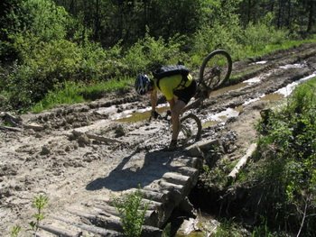 Za cmentarzem pedałujemy wprost tragicznie zrytym, niebieskim szlakiem, który wiedzie grzbietem lekko opadając to znów wznosząc się o kilka metrów. Mijamy leśne jeziorka i dajemy upust naszym akrobatycznym zdolnością, gdy co kawałek napotykamy całkowicie nieprzejezdne koleiny wyryte przez ciężki sprzęt... Tak, a potem znajdzie się jakiś mądrala i zamknie szlak dla rowerów: „Bo niszczą nawierzchnię szlaku” (pozdrowienia dla Pienińskiego Parku Narodowego). Przejazd do kolejnej przełęczy nad Banicą urozmaica nam jeden dłuższy i szybki zjazd i... kąpiel błotna na jego końcu. Mijamy Wierch Wirchne i po kilkunastu minutach docieramy do drogi łączącej Małastów z Krzywą. Tutaj napotykamy wreszcie ludzi a dokładniej dwójkę rowerzystów jadących w kierunku Jasionki. Zastanawiamy się przez chwilę gdzie mamy dalej jechać. Oprócz widoków nie ma tu nic ciekawego. Nieopodal w Banicy można znaleźć jedynie kilka zabudowań... Nie ma ani błota, ani korzeni ani nawet jednej marnej dziury w asfalcie, w którą można by wpaść kołem... słowem rowerowa nuda. Udajemy się drogą w lewo, zjazd z przełęczy jest krótki i niezbyt szybki. Mijamy skrzyżowanie z dochodzącą od lewej strony drogą z Małastowa i po chwili zaczynamy wdrapywać się asfaltowym podjazdem wypatrując niecierpliwie zaznaczonego na mapie skrętu w lewo na leśną drogę. Wreszcie jest! Skręcamy i pniemy się szutrowym podjazdem w górę po lewej zostawiając widok niewielkiej dolinki. Kilkaset metrów dalej u podnóża Magurycza Dużego (776m npm.) napotykamy rozjazd. Kierujemy się w prawo za głównym traktem. Jadąc prosto bardzo trudną i kamienistą dróżką dojechalibyśmy do żółtego szlaku, który zaprowadziłby nas do centrum Bartnego. Tego jednak nie chcemy. Dalej jest już tylko weselej... Gdy osiągamy szczyt wzniesienia naszym oczom ukazują się czerwone znaczki głównego szlaku. Droga staje się coraz bardziej zryta i czekający nas zjazd zapowiada się nader interesująco. Podczas gdy ja z Piotrkiem grzecznie nabieramy prędkości, Kuba postanawia wjechać w jakieś błotko. Nie trzeba długo czekać na efektowne OTB na jednej z głębokich, błotnych kałuż. Na szczęście nic się nie stało, mało tego! Kuba postanawia powtórzyć wyczyn do zdjęcia i po chwili wspaniałym parabolicznym lotem wylatuje przez kierownicę... Brawa za odwagę! Dalej prawdziwy tor trialowo-dirtowy z niespodziankami. Szlak poprzecinany strumieniami wody wypływającymi z lasu po prawej stronie, rozkopany przez ciężki sprzęt i pokryty połamanymi gałęziami. Po prawej drzewostan zaczyna się przerzedzać i po chwili ukazuje się nam otwarta przestrzeń z zabudowaniami Bartnego oraz Męcińską Górą majaczącą w tle. Piękne słońce i doskonała widoczność pozwala nam do woli nacieszyć się wspaniałymi widokami. Odbijamy na chwilę ze szlaku i brniemy w zielonym morzu traw przez kilkaset metrów aż dojeżdżamy do asfaltu i rozjazdu prowadzącego do bacówki w Bartnem. Od obiadu dzieli nas tylko 200m – tak głosi tabliczka przybita na drzewie. Zapomnieli jednak dopisać, że na ten obiad będzie pod górę, niby niewielką, ale dla trójki bikerów mających za sobą 35km korzeni, kamieni, błota, podjazdów i zjazdów, kolein i wertepów to niewielkie wzniesienie wydaje się być strome niczym Mount Everest... Eee tam, na Mt Everest nie mają takiego pysznego żuru i pierogów! Kilka minut później na zacienionym stole przed bacówką dymią trzy ogromne talerze żuru i trzy talerze ruskich pierogów. Okazuje się jednak, że dla żołądka wygłodniałego bikera nie ma granic i cały obiad znika w mgnieniu oka. Jeszcze po dwa kubki Coli i zaspokajamy pierwszy głód. Pyyycha!