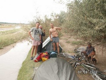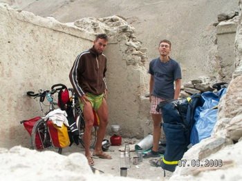 Jechało się bardzo dobrze - super nawierzchnia. Niestety szybko kurczyły się nam zapasy wody, a w Chinach wcale nie jest łatwo kupić ja - a butelki max 0,6l. Niestety na ok84km Piotrek nam padł:( gorączka i wyczerpanie dało o sobie znać. Kiedy on dochodził do siebie ja&Dawid kąpaliśmy się w strumieniu - pierwszym cieplnym i czystym - było po prostu bosko:)) Naszym noclegiem były ruiny chaty, bez dachu, ale z murami zabezpieczającymi nas od wiatru. Na kolacje makaron - nasz:) 08.08.2006 Ghez- 25km za Kara Kul wys. 3890 dyst.85 sred 16 Dziś było MEGA MOCNO. Zaczęliśmy od podjazdu i na podjeździe skończyliśmy dzień. Podjazdy długie i konkretne. Nogi dostały swoje. Największym jednak zmartwieniem był brak wody. Na cale szczęście zdarzają mi się prześwity geniuszu;) zaczęliśmy prosić o wodę przejeżdżające autobusy i auta. Tym sposobem udało nam się dostać 8litrow wody:) Po drodze wstąpiliśmy do juty pasterza, który poczęstował nas herbata z mlekiem jaka (niestety odplatanie - w końcu muszą zarabiać na turystach).Pomimo naszej ostrej walki z podjazdami ciężko było się przebić na "blat" gdyż zjazdów było tego dnia jak na lekarstwo:( Tego dnia spotkaliśmy również Hiszpanów, którzy przyjechali w te okolice, aby zdobyć gore Muztagh Atu (7546m n.p.m). Zajmie im to ok.20 dni, a robią to po to, aby zjechać z niej na nartach(2 godz. zabawy). Dziś spotkało nas również małe szczęście w nieszczęściu. Kupiliśmy sobie arbuza na obiad. Niestety podczas jednego z kamienistych zjazdów spadł i roztrzaskał się na kawałeczki:( Sytuacje te widzialny osoby jadące w autobusie za nami. Chyba zrobiło im się nas żal, albo spodobaliśmy się dziewczynom w nim jadącym, bo zatrzymały się i dały nam po piwie na pociechę;) Noc spędziliśmy w garażu pewnej bazy budowlańców, którzy okazali się bardzo mili (częstowali nas wszystkim, co mieli!).Szkoda tylko ze po tym garażu grasowały szczury, a temperatura w nocy oscylowała koło zera:( 09.08.2006 do Tahgurganu dyst 76km sred 26,3