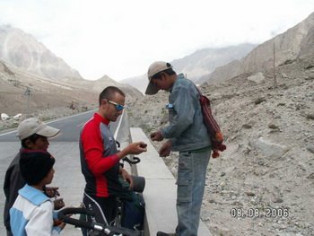 Pobudka była bardzo wcześnie. Nie szło po prostu spać w tym zimnie. Od razu przywitał nas podjazd na 4080m n.p.m.(ten podjazd Dawid pokonał już dzień wcześniej, bo mu się nudziło;) Zajęło nam to 45min. Potem trochę zjazdów i podjazdów. Po drodze mieliśmy dużo przerw, bo wyboista droga powodowała nagminne gubienie rzeczy. Ja (ja, czyli Sebastian) zaliczyłem pierwsza porządną wywrotkę, która o maly włos...No, ale jedziemy dalej...W malej wsi udało nam się zorganizować obiad - przehandlowaliśmy 3 jeny + 2 cukierki + smycz do kluczy na arbuza. Niestety długo się nie cieszyliśmy arbuzem w żołądku...musiało być awaryjne hamowanie;) Poza tym droga szła nam na prawdę szybko. W Tahgurganie spotkaliśmy parę Niemców, którzy oznajmili nam źle wiadomości: ,,You can not pass the chinise board by bike". Nie pomogły żadne próby i tłumaczenia na granicy. Dowiedzieliśmy się, że mamy się stawić o 10.00 rano i koniec. Noc spędziliśmy w Trafic Hotelu w pokoju z młodym Japończykiem. 10.08.2006 Na Khunjerab Pass i dalej dyst 87km sred - trudno określić Rano stawiliśmy się na granicy. Autobus kosztował 30$/os do Sostu (Chińczycy nie zgodzili się na nasz podjazd na przełęcz).My jednak autobusem nie pojechaliśmy. "Udało" się nam doczepić do Amerykańskiego turysty, który sam wynajętym busem jechał do Pakistanu. Odprawa jak zwykle szła długo (nie nasza - system śmierdzące skarpety działa rewelacyjnie). Na przełęczy zaczął się nieprzyjemny incydent - kierowca zażądał od nas 100$ za przejazd (126km) - pojeb...No, ale nie było siły - udało nam się zejść z ceny i za 60$ otworzył bagażnik. Zamontowaliśmy sakwy i zjechaliśmy szybko, bardzo szybko na dół. Plan był jasny. Podjeżdżamy do strony Pakistanu. Podjazd ciągnął się niemiłosiernie do tego wysokość dawała o sobie znać i to bardzo. Udało się!!! Wjechaliśmy na 4730m n.p.m. Każdy z nas czul się rewelacyjnie w końcu nie co dzień zdobywa się takie wysokości. Dla każdego z nas ta przełęcz znaczy cos innego, ale wszyscy czuliśmy coś wewnątrz nas, co dawało poczucie siły. Po parunastu minutach odpoczynku na górze rozpoczęliśmy najdłuższy zajazd w życiu:)) Noc spędziliśmy w pokoju gościnnym Parku Narodowego Kunjerab wraz z przemiłymi leśnikami (pomimo, że muzułmanie wódkę chińska bardzo lubili;) 11.08.2006 Pare km za miejscowością Hunza dyst 142km sred 20km/h