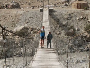 Za późno się zebraliśmy. Zaraz za Gilgitem Pakistańczycy męczyli się z zwałami błota i kamieni. Droga była totalnie zablokowana. My jednak jakoś się przecisnęliśmy z rowerami. Droga schodziła nam szybko, nawet bardzo. Spotkaliśmy po drodze Włocha, który samotnie przemierzał KKH. Ostrzegł nas ze 30km przed Chilas droga jest zablokowana na długości 10km i nie ma szans żebyśmy dziś pokonali te przeszkodę. My nie przejęliśmy się tym zbytnio gdyż nie jedno już tu widzieliśmy:). Na 70km zaczęło mocno wiać. Dawid dal bardzo mocna zmianę przez 10 km walczył z wiatrem. Niestety po tym odcinku opadł z sił i przyszło mi prowadzić nasza karawanę. Ja już po 7km miałem dość. Na pomoc przyszedł mi laczek, który na moment dal nam odpoczynek. Niestety dalej było coraz to gorzej. Brak wody plus słonce i wiatr wykańczało nas. Na 95km zaczęła się blokada drogi. W zasadzie zaczęliśmy się czuć jak na wyścigu XC. Droga zamieniła się w ledwo przejezdna. Mnóstwo kamieni i błota. Do tego ciągle podjazdy i zjazdy. Mr Lang mógłby tu zrobić jedna edycje swoich wyścigów;). W nocy oczywiście burza piaskowa. 14.08.2006 35km przed Dassu dyst 120 sred 18km/h Wstaliśmy wcześnie. O 6.00 byliśmy gotowi do drogi, ale już o tej godzinie było gorąco. Droga do 60km szła dobrze. Niestety później znów zabrakło nam wody. Piotrek zaczął się tez już słabo czuć. Dzieciaki zaczęły tego dnia używać kamieni jako argumentu, aby dać im "one pen". Droga przestała iść już tak dobrze jak z rana. W zasadzie szło źle. Do Dassu wiedzieliśmy, że nie dojedziemy. Zaczęliśmy więc szukać miejsca na nocleg. Udało się nam znaleźć cos ekstra. Miejscówa przy czyściutkim strumieniu. Nareszcie czyści:)) Noc nadeszła szybko - sen też, ale nie na długo. Obudziło mnie światło latarki skierowanej w moja twarz oraz widok kałasznikowa w rękach jakieś postaci. Oj zrobiło się mi momentalnie gorąco. Okazało się, że to policjant - na szczęście. Owy policjant stwierdził, że miejsce, w którym śpimy jest niebezpieczne i mamy jechać z nim na komisariat. Tak wiec pod eskorta dwóch radiowozów przemieściliśmy się 4 km i noc spędziliśmy z pakistańska policja. 15.08.2006 Do Besham dyst. 100km sred 16,4km