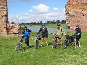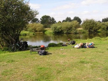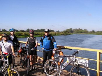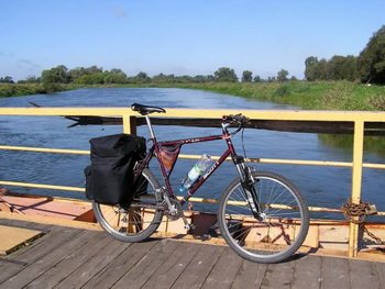 Oglądamy tzw. słup milowy, który uznawany jest za najstarszy drogowskaz w Polsce, wskazujący połowę drogi z Kalisza do Kruszwicy. Inskrypcja na nim głosi, że został ufundowany przez komesa Piotra w 1151 r. Dalej ruszamy na szlak, który początkowo prowadzi bocznymi drogami, przez małe miejscowości, aby doprowadzić nas do przeprawy promowej. Tutaj mała niespodzianka, prom nie ma silnika, a pływa z jednej na drugą stronę rzeki. Dowcipny przewoźnik wspominał coś galernikach pod pokładem, ale nie daliśmy temu wiary. Zmienia się ustawienie promu względem prądu rzeki i napór wody przepycha prom. Proste, tanie i ekologiczne. Pierwszy raz mam na rowerze sakwy i trochę obawiałem się jazdy z nimi, ale spisują się świetnie. Przeniesiony jest środek ciężkości do tyłu i nie ma to wpływu na jazdę. Jedzie się stabilnie i pewnie. Rower mocno stracił na wyglądzie, ale w tej chwili doceniam to, że wszystko czego mi potrzeba mam ze sobą. Było dużo lepiej niż sobie to wyobrażałem i zachęcam wszystkich, którzy nie próbowali do jazdy z sakwami po łatwym i równym terenie. Dopiero na wertepach tzw. "ścieżkach trzęsidupach" komfort jazdy znacznie się obniżał.