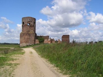Rzeka doprowadza nas do Koła. Tutaj zbaczamy na chwilę ze szlaku, żeby zobaczyć malownicze ruiny zamku, odetchnąć, wyrównać poziom węglowodanów i nawodnić organizmy, krótko mówiąc dłuższy popas. Kolski zamek został wybudowany w ostatnich latach panowania króla Kazimierza Wielkiego, jeszcze przed 1362 rokiem. Był typową gotycką fortecą, a naszych czasów dotrwały jedynie ruiny budowli - fragmenty zewnętrznych murów i dolna część drugiej wieży. Zdobyliśmy mury zamku po krótkiej wspinaczce, okazało się, że murowane schody prowadzą na szczyt baszty. Oczywiście weszliśmy tam, żeby zobaczyć widok na okolicę z góry. Nie polecam tego osobom z lękiem wysokości. Rzeka sprawia wrażenie jakby miała za chwilę wylać się ze swego koryta co mam nadzieję udało mi się ukazać na zdjęciu.