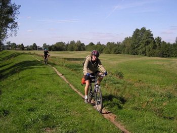 Drugiego dnia po wieczornym ognisku połączonym z dyskoteką do "późnych godzin wieczornych", ciężko było wstać. Dopiero około 10:00 udało nam się wyjechać. Przez godzinę był to rajd milczenia zanim zaczęły nam powracać humory. A może to te 130 km z poprzedniego dnia, a nie tańce powodowały ociężałe nogi? Kontynuowaliśmy naszą wycieczkę wzdłuż rzeki, częściej odpoczywając i bez większego pośpiechu. Plan zakładał dotarcie do Sieradza i powrót do domu pociągiem około 17:00. Do przejechania zostało 55 km, więc tym bardziej ociągaliśmy się podczas jazdy. Od Miasta Warta, jechaliśmy na azymut wałami, gdyż szlak ma tu swój koniec. Było trochę wertepów, trawy po pas, ale przed Sieradzem zaczęły się piękne single-track'i. Można było dokręcić trochę mocniej korbami. Piękna plaża w Sieradzu zachęcała do kąpieli, ale zrezygnowaliśmy z pływania. Postanowiliśmy coś przekąsić, przed podróżą do domu. W pociągu zastanawiałem się, kiedy będzie czas na powrót w te strony. Więcej informacji o Nadwarciańskim Szlaku Rowerowym znajdziecie tu: