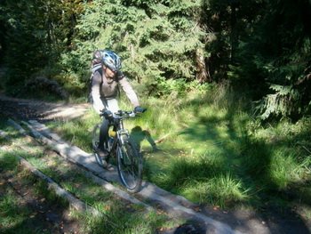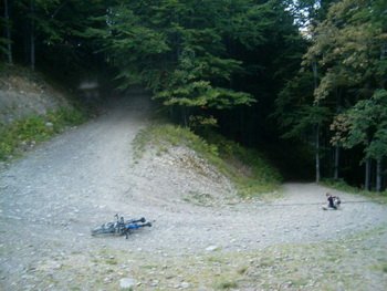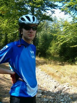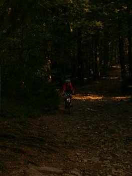 Następnego dnia ruszyliśmy zielonym szlakiem do Brennej. Był to pierwszy większy zjazd, miejscami dosyć stromy i bardzo kamienisty, ale widoki wynagradzały wszelkie uciążliwości. W Brennej odczułem jednak klasę swojego amortyzatora i pierwsze objawy bolących rąk :). Przed miejscowym sklepikiem zjedliśmy pyszne śniadanko (pomijając zepsuty serek, który nam sprzedano:/) i ruszyliśmy dalej zielonym szlakiem w stronę schroniska na Równicy. Znowu był to nie do końca najlepszy pomysł gdyż znaczną część z 6 km trasy nieśliśmy rowery na plecach a tylko miejscami dało się podjechać. W końcu jednak znaleźliśmy się na szczycie i czekał na nas piękny zjazd do Ustronia. Na asfaltowej części przy okazji pobiłem swój dotychczasowy rekord prędkości :). Zaczęliśmy błądzić po Ustroniu w poszukiwaniu spożywczaka w celu uzupełnienia zapasów żywnościowych i wylądowaliśmy.... na Manhattanie :D. Kto nie wierzy, niech sprawdzi na mapie. Po „obiedzie” udaliśmy się w kierunku wyciągu krzesełkowego na Wielką Czantorię, lecz tutaj czekała na nas niemiła niespodzianka, otóż okazało się, że wyciąg jest w remoncie i jest nieczynny aż do grudnia. Chcąc – nie chcąc musieliśmy zrezygnować z planów noclegu na Wielkim Stożku i ruszyliśmy w stronę schroniska na granicy polsko – czeskiej na Wielkiej Czantorii. Znowu szlak raczej stromy i dużą część trzeba było pokonać prowadząc rowery. Zbliżała się już 19, dotarliśmy do schroniska, ucieszeni, że mamy gdzie spędzić noc, pytamy jakiegoś Czecha chodzącego po schronisku ile za nocleg a on nam odpowiada, że u nich w schronisku nie ma noclegów ! Środek lasu, robi się już ciemno i zimno a my nie mamy gdzie spać... W końcu jednak udało nam się z nim dogadać i powiedział nam o stacji turystycznej Światowid znajdującej się jakieś 3 km na południe wzdłuż granicy. Nie tracąc czasu udaliśmy się w tamtym kierunku i już prawie po ciemku znaleźliśmy domek z napisem „Światowid”. Był to niewątpliwie najlepszy nocleg całego wyjazdu, pokoje urządzone przytulnie jak w domu, bardzo miła pani a przy tym standardowa, niewygórowana cena – 20 zł/os. Wrzątek oczywiście za darmo :).
