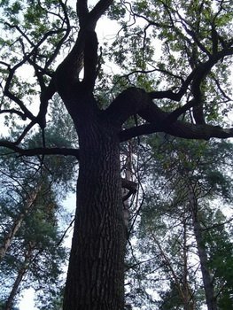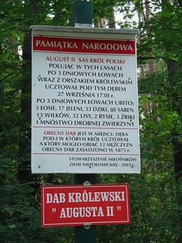 Przez Osiedle Królowej Bony lub za znakami zielonego szlaku docieramy do tzw. Drogi Królewskiej prowadzącej w głąb Puszczy. Jak głoszą podania właśnie tym szlakiem podążali na polowania królowie wraz ze swoją świtą. Droga nie jest zbyt ruchliwa, ale rozkoszując się szumem drzew, pięknym widokami i świeżym leśnym powietrzem nie zapominajmy, że możemy spotkać tam poza innymi rowerzystami i pieszymi turystami również rozpędzone samochody. Zielonym szlakiem jadąc na wschód docieramy do dębu Augusta II. Jak głosi legenda pod owym drzewem (a właściwie pod tym, które niegdyś rosło w tym miejscu) po trzydniowych łowach ucztował król. Dąb jak dąb, ale historię dobrze jest znać, tym bardziej, jeżeli chcemy błysnąć przed znajomymi jakąś ciekawostką;).