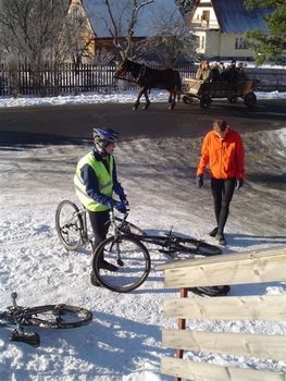 Za cel pierwszej wycieczki obraliśmy szczyt Policy. Mając jednak na uwadze bardzo krótki dzień, mróz i stosunkowo dużą ilość śniegu w górnych partiach zdecydowaliśmy się ułatwić sobie trochę zadanie i wyjechać na Mosorny Groń wyciągiem krzesełkowym. Asfaltem, przez Zawoję Widły dojechaliśmy więc do dolnej stacji. Tam okazało się jednak, że co prawda nie ma problemu z wywiezieniem rowerów na górę, jednak wyciąg (wyłącznie dla celów turystycznych, ponieważ na stoku było za mało śniegu) startuje dopiero w południe. Półtorej godziny nie chciało się nam czekać, więc podjechaliśmy jeszcze ok. 2 km w górę asfaltem i skręciliśmy w lewo w stokówkę, którą półtora roku temu jechałem na wycieczkę z Krowami.