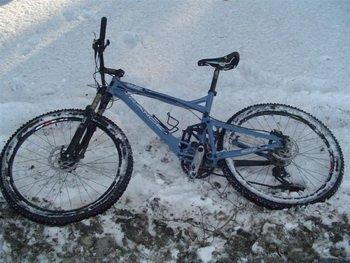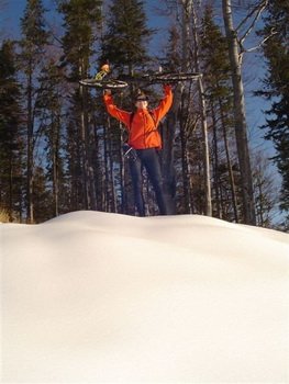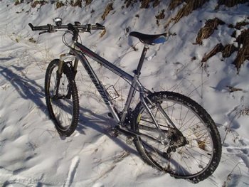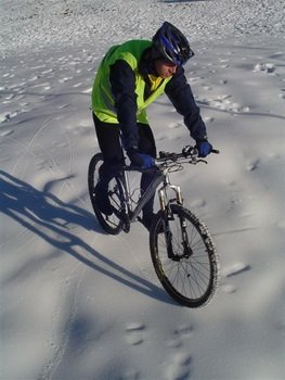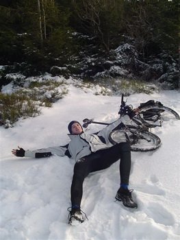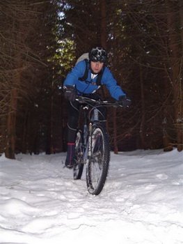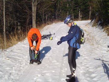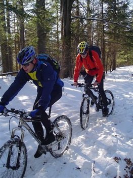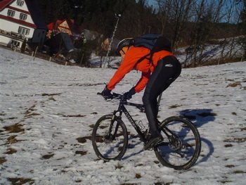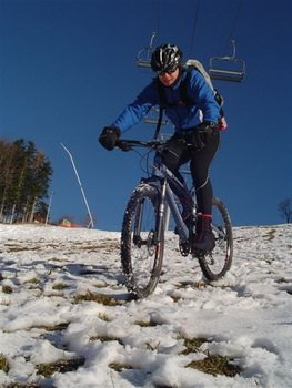 Na szczęście to nie był jeszcze koniec zjeżdżania. Zamiast jechać w dół asfaltem, po upewnieniu się, że nie ma żadnych zakazów dla rowerów odbiliśmy w niebieski szlak. Tam dopiero czekała nas niezła zabawa. Ścieżka pokryta była maksymalnie dziesięciocentymetrową warstwą śniegu i poprzecinana licznymi strumieniami, nad którymi zbudowane były drewniane mostki. Może nie takie w stylu North Shore, ale i tak mieliśmy niezłą radochę. W końcu szlak wrócił na asfalt i nie było już tak ciekawie. Musieliśmy natomiast włożyć na siebie wszystko co mieliśmy, bo zrobiło się bardzo zimno. Dokręcaliśmy więc ile było sił w nogach i dzięki temu stosunkowo szybko dotarliśmy z powrotem do naszego pensjonatu.