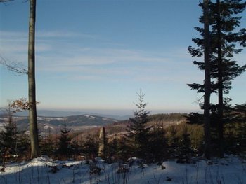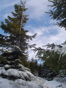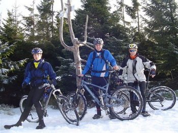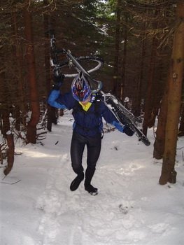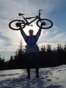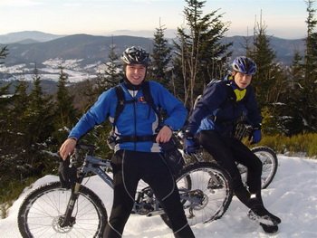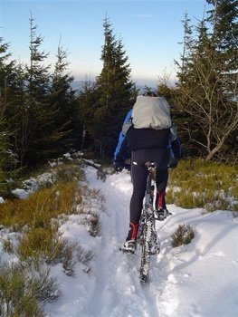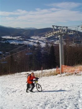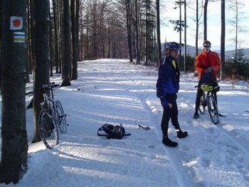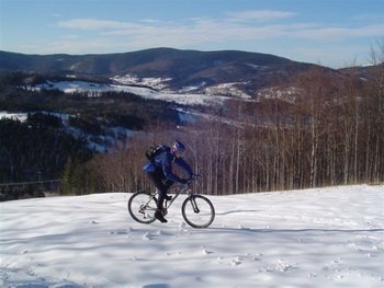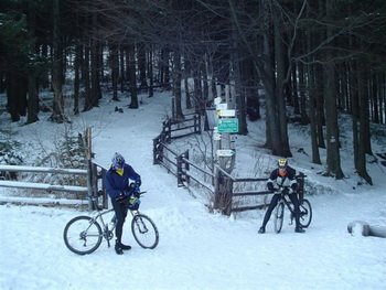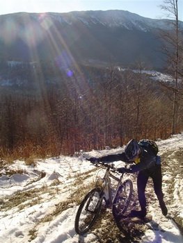 Nie pamiętam kiedy ostatnio musiałem dokręcać z młynka i tyle się napocić jadąc w dół. I tak dobrze, że w ogóle dało się jechać. W niektórych miejscach napotkaliśmy dodatkowo na utrudnienia w postaci powalonych przez wiatr drzew. Im niżej jednak zjeżdżaliśmy tym sytuacja stawała się coraz lepsza. W pewnym momencie pruliśmy już z całkiem przyzwoitą prędkością po ubitym śniegu całkiem szeroką ścieżką. Żeby jednak nie było zbyt łatwo do pokonania mieliśmy jeszcze jedno większe wzniesienie. Na Syhlec (1146 m npm) też nie dało się wyjechać i znów zaczęło się pchanie i noszenie rowerów. Świadomość zbliżającego się obiadu i ciepłej wody pod prysznicem dodała nam skrzydeł i bez zbędnego narzekania dotarliśmy na sam szczyt.