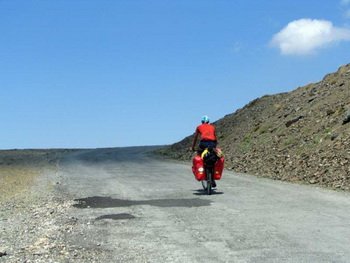 Wstajemy o 7 razem z wszystkimi atakującymi Mulhacen. Zjazd jest boski, ale zimny. Na dole jest już upał, jesteśmy tam o 10.00. Ruszamy w drogę, której nie dość, że nie ma na mapie, to jeszcze jej istnienie wzbudzało dyskusje w informacji turystycznej – mieliśmy sprzeczne informacje co do jej istnienia. Droga okazuje się być cudownie położona, z asfaltem o charakterze dywaniku. Oczywiście brak oznakowań na drodze powoduje, że w jednym z miast się gubimy, ale po perturbacjach dojeżdżamy do La Pezy. Zjeżdżamy do Guadixu. Tam na postoju okazuje się, ze bagażnik Tomka złamał się, a na dodatek ułamał mocowanie. Myślimy, że to już koniec wyprawy. O ile sam bagażnik da się spiąć obejmą, to rama....rozpacz. Sprawdzamy pociągi. Tomek w ramach desperacji szuka sklepu rowerowego. Tam mechanik z wesołą miną mówi : no problem, i wyciąga zza lady.... spawarkę..... W 20 minut mamy naprawiony rower, a na dodatek sprzedawca nie chce od nas żadnych pieniędzy!!!! Zapytany o autostrady tłumaczy, że wszyscy tutaj jeżdżą rowerami po ekspresówkach....Jeśli mamy się nie przejmować, to się nie przejmujemy, i zajeżdżamy do Bazy. A tam oczywiście żadnego campingu, jedynie hostal. Nie mając ochoty na wydatki znajdujemy przystanek za wsią i śpimy....