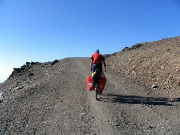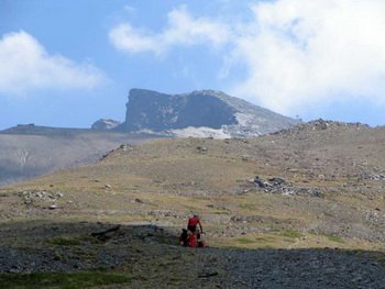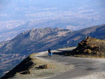 10 sierpnia - wspomnienie św. Wawrzyńca męczennika. Z tą myślą ruszyliśmy na podbój "Carretera mas alta de Europa". Zaczynamy z pełnymi sakwami, 8 litrami wody, czekoladami, ciastkami i innym prowiantem. Na początku jazda tragiczna, główna droga z dużym ruchem. Serpentynami wspinamy się na grzbiet, a szczytu wciąż nie widać. Zatrzymujemy się na odpoczynek co 4 km, ale już wchodzimy w rytm podjazdu i jest lepiej. Wyżej również nie ma takiego słońca. Na wysokości 2500 metrów parking i mały bazar, a także szlaban dla samochodów. Kupujemy brakującą wodę (za 1,5 euro) rozmawiamy chwilę ze sprzedawcą i ruszamy dalej. Asfalt jest już gorszy, i droga zaczyna się robić coraz bardziej stroma, choć i tak spodziewaliśmy się gorszej nawierzchni. Stromo, wąskie serpentyny niemal wyrwane w skałach, ale również niesamowite widoki na kilkadziesiąt kilometrów. W końcu docieramy do rozwidlenia: na szczyt i do Capileiry. Asfalt pod sam koniec zmienia się w szuter, a na końcu skały. Nasze rowery zatrzymują się na wysokości około 3480 metrów i to jest najwyższe miejsce gdzie mogły wjechać asfaltem w Europie. Na sam szczyt prowadzi ścieżka – kilkanaście metrów. Jest 19.00 - 11 godzin podjazdu. Siadamy na szczycie i kontemplujemy, ale że jest późno musimy się zbierać na nocleg. Co ciekawe pod szczytem wieje, a na samym szczycie nie.... Zjeżdżamy do 'refugio' na wysokosći 3200 m, czyli samoobsługowego schroniska, gdzie śpimy w międzynarodowym towarzystwie – czworo Polaków, dwoje Holendrów – sakwiarzy i dwójka Hiszpanów.