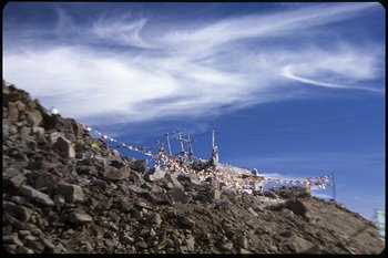 Nasze organizmy domagają się tlenu. Wysokość daje znać - wydolność organizmu spada drastycznie. Wszystko odbywa się w zwolnionym rytmie. Trzeba jechać powoli stałym tempem, każdy gwałtowniejszy ruch kończy się zadyszką i postojem w celu złapania kolejnego oddechu. Ostatnie metry podjazdu i... przełęcz jest już widoczna z daleka. Khardung La zdobyta. Cały podjazd pod Khardung La zajął nam w sumie około 12 godzin. Jesteśmy na wysokości 5600 m npm. Z przełęczy cudowna panorama na ośnieżone szczyty pasma Karakorum, które barwiły się na kolor pomarańczowy od zachodzącego słońca.