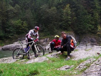 Raz szlakiem rowerowym, raz niebieskim pieszym, raz jadąc, raz pchając dotarliśmy pod samo schronisko. Nie weszliśmy jednak do środka tylko kontynuowaliśmy jazdę. Tuż przed Wielką Przehybą zostawiliśmy niebieski szlak i odbiliśmy czerwonym w prawo. Nagle gdzieś się zapodział Maciek. Wróciliśmy się kawałem i spotkaliśmy biedaka z dziwnym grymasem na twarzy. Okazało się, że przekręciło mu się siodełko i zaczęło mocno uwierać w jedną z najcenniejszych części ciała. Poratowaliśmy nieszczęśnika imbusem, co spowodowało natychmiastową ulgę i rozwiało strach o zagrożone ojcostwo.