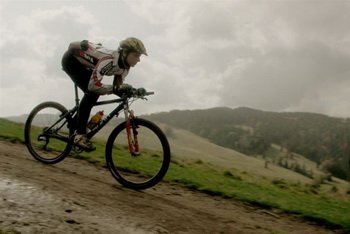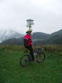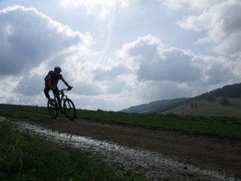 W okolicach Sedla Cerla niebieski i czerwony szlak rozdzieliły się. Robiło się późno, więc wybraliśmy krótszą opcję i pojechaliśmy niebieskim. Trasa była przyjemna, ale śliska. Okazało się, że za śliska. W jednym miejscu na mokrej glinie postawiło mi rower bokiem i tak wyrżnąłem o ziemię prawym barkiem, że myślałem, że obojczyk, rozleciał się w drobny mak. Usłyszałem jeszcze w ręce chrupnięcie, jakby łamanej gałęzi. Aż się bałem sprawdzać, co się stało. Leżąc w błocie zacząłem macać kości. O dziwo wszystkie były całe. Wsiadłem więc ostrożnie na rower i obiecałem sobie więcej nie szaleć, bo coś czułem, nie jestem w zbyt dobrej dyspozycji ;).