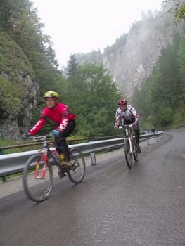 Kawałek dalej przekroczyliśmy granicę Polsko-Słowacką i południowym brzegiem na przełomie Dunajca szutrową droga obraliśmy kierunek na Cerveny Klastor. Koła rozpędzonych rowerów wzbijały wodę z wilgotnej od deszczu ścieżki, dlatego, pomimo, że z góry na nas już nie kapało, byliśmy cali koszy. Specjalnych widoków na góry też nie mieliśmy, ale niesamowite wrażenie robiła wzburzona opadami rzeka, na której niepewnie kołysały się drewniane łódki wypełnione wystraszonymi turystami.