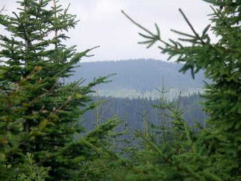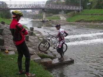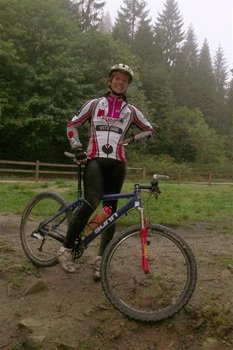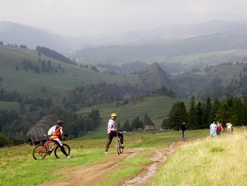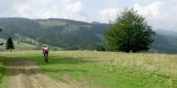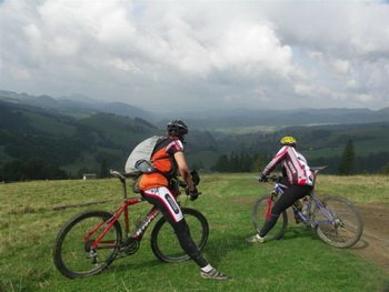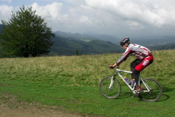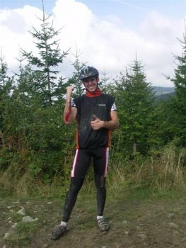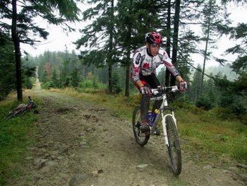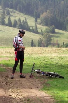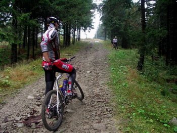 Aż do Złocistego Wierchu było prawie cały czas pod górę. Dopiero później zaczęło się trochę wypłaszczać i czasem nawet zjeżdżaliśmy. Ogólnie zaczęło się jechać bardzo przyjemnie, tym bardziej, że Marek nie ciągnął nas przez szczyt Radziejowej, tylko ominęliśmy ją z południowej strony trasą narciarską (podobno tak jak na Transcarpatii). O złych rzeczach szybko się zapomina, więc o glebie z dnia poprzedniego też nie pamiętałem. A szkoda, bo glebnąłem po raz drugi. Tym razem nic mi jednak nie chrupnęło, ale efekt był widoczny od razu. Prawy łokieć przecięty o kamienie w dwóch miejscach do kości, cała lewa ręka zeszlifowana, cholerny ból w lewym barku i co najgorsze rozwalony plecak. Tak na serio najbardziej mnie wkurzyło, że urwałem zaczep od rurki bukłaka. Ręce mi się jeszcze trzęsły od adrenaliny (bólu jeszcze nie czułem), ale wsiadłem na rower i pojechałem dalej.