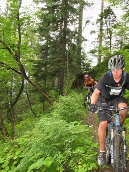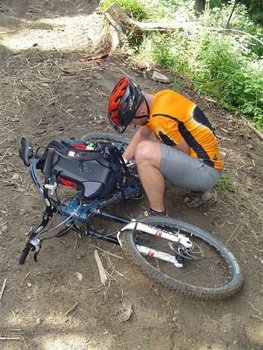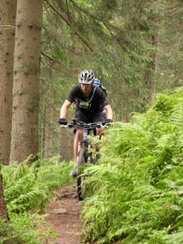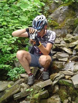 Gdy znów skryliśmy się w lesie, czekał na nas jeden z lepszych zjazdów tego sezonu. Na rozgrzewkę szeroko i delikatnie. Później jednak nie było tak łatwo. W pewnym momencie Zobaczyłem Marcina lecącego przez kierę, za chwilę zgłębił Bartek, mnie, co prawda na raty, udało się jednak zjechać stromy, pokryty „telewizorami” odcinek. Później seria singletracków zakończona cholernie szybkim i skomplikowanym technicznie zjazdem do samej Zawoi. Pierwszy raz od dłuższego czasu na dole poczułem drżenie rąk. Wytelepało nas niemiłosiernie. Momentami było bardzo niebezpiecznie, na szczęście wszyscy byli cali i zdrowi. Skoczyliśmy na szybki obiad i kontrolną kawkę i pojechaliśmy dalej w kierunku Suchej Beskidzkiej.