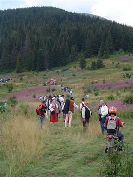 Malinowa uczta pokrzepiła nasze wymęczone członki i w końcu zaczęło się nieźle jechać. Trasa poprzeplatana była podjazdami i zjazdami raczej o średnim stopniu trudności. Im jednak dalej jechaliśmy tym czuliśmy coraz mocniej smak przygody. Chwilę jednak późnie j poczuliśmy smród spalin wydobywających się w rur wydechowych pięciu motorów, które minęły nas na pełnym gazie. Za chwile kolejne trzy, a 10 min później gość na quadzie. Spojrzeliśmy po sobie, rzuciliśmy po kilka słów uznawanych za obraźliwe i pojechaliśmy dalej. Aż tu nagle kolejna grupa motocyklistów. Jasny gwint! O co chodzi? Za Okrąglicą zaczęła się już prawdziwa tragedia. Na szlaku musieliśmy wyprzedzać terenówki i inne dziwne pojazdy. Okazało się, że na Hali Krupowej odbywa się jakaś wielka impreza. Fajnie, że tyle ludzi się na nią wybrało, szkoda tylko, że jeepami i motorami. Nie dość, że goście wjechali nielegalnie w góry, to jeszcze bezmyślnie kręcili sobie „bączki” niszcząc i zatruwając środowisko. Nie wspominając, że polowa ludzi była na bani. Załamać się można. Nawet nie próbowaliśmy się wbijać do schroniska na tamtejsze znakomite pierogi ruskie. Uciekaliśmy z Krupowej ile sił w nogach.