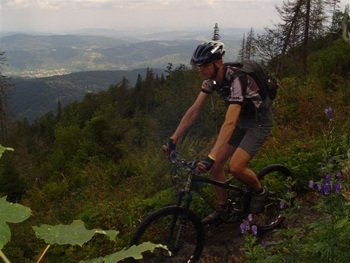 Na szczęście ryk silników i dym z rur wydechowych został daleko za nami. Skręciliśmy z drogi prowadzącej przez szczyt Policy i zielonym szlakiem zaczęliśmy genialny trawers. Już pierwsze metry pozwoliły nam zapomnieć o wcześniejszej niemiłej niespodziance. Trasa prowadziła wymagającą maksymalnego skupienia, wąską, krętą i najeżoną przeszkodami trasą. Niewiele jest tak skomplikowanych, a zarazem przejezdnych odcinków w naszych górach. Osobiście musiałem jednak wznieść się na wyżyny moich rowerowych umiejętności. Dziękowałem Bogu za mojego (już obecnie sprzedanego) Trance’a. W tamtych rarunkach spisywał się wyśmienicie. W połowie rezerwatu im. prof. Klemensiewicza zrobiło się trochę łatwiej, dzięki czemu mogliśmy pośpieszyć. Ciężko było się zdecydować, na czym się skupić. Z jednej strony niesamowita trasa, a z drugiej przepiękny widok na Beskid Makowski. Takie chwile zostają w pamięci na długi czas.