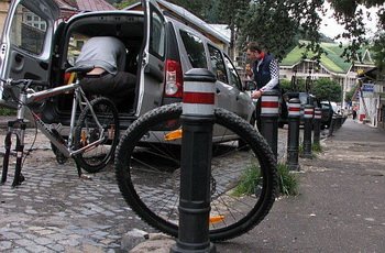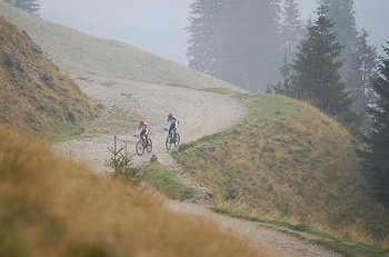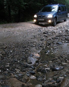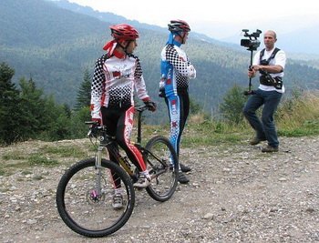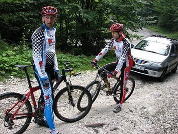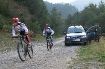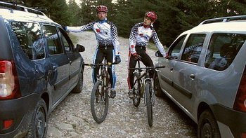 Kolejny dzień stłumił naszą radość, gdy budząc się za oknem ujrzeliśmy jedynie chmury i smugi deszczu, a temperatura wydawała się przeraźliwie niska. Nie mieliśmy wyjścia, zostało nam w sumie jedynie 5 dni na nakręcenie zdjęć. Załadowaliśmy rowery na samochody i pojechaliśmy na początek naszej filmowej trasy. Pierwsze zdjęcia - rowerzyści wysiadający z samochodu. Panujący na dworze chłód i wszechogarniająca wilgoć, wywołują grymas na naszych twarzach. Wcale nie wyglądamy na pełnych determinacji i niezłomnej woli walki, ale przełamujemy się. Najgorzej jest zacząć. Ruszamy w górę na podbój gór. Mamy nadzieję, że sławetna górska zmienność pogody działa w obie strony. Gorzej przecież już być nie może. Wilgotność jest tak duża, że aż ją widać. Na szczęście opady ustały i właściwie nie wiadomo czy jeszcze mży, czy czuć mglistą zawiesinę kropel w powietrzu. Tak jak poprzedniego dnia jadąc pod górę rozgrzaliśmy się, a na niebie zaczął przedzierać się błękit (właściwie to on był tam cały czas, tylko przysłaniały go gęste chmury). Nadzieja zagościła w naszych sercach. Wykorzystaliśmy daną nam szansę do cna (zmierzchu) i nakręciliśmy tego dnia sporą część materiału. Po powrocie do pensjonatu, ledwo starczyło nam sił na wypicie rumuńskiego piwa (robią prawie tak dobre jak Polacy) i obejrzenie owoców minionego dnia.