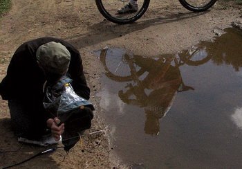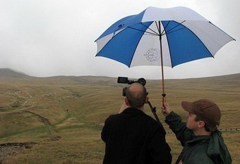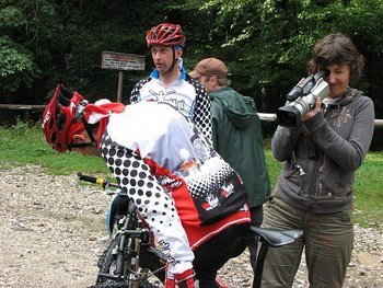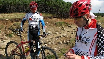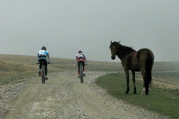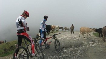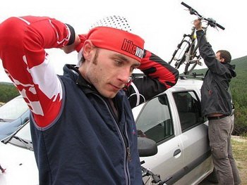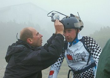 Następny poranek był znacznie sympatyczniejszy - nie padało, a na niebie na przemian pojawiały się chmury niższe i wyższe, a nawet błękit. Wyraźnie wiał silny wiatr. Umówiliśmy się z filmowcami, że spotkamy się w miejscu ostatnich dokonań. Szkoda było stracić okazji przejechania się rowerem w tak dobra pogodę. Dotarliśmy na miejsce. Sprawnie wykonaliśmy plan, pnąc się w górę. Jednak wraz z wysokością rósł w siłę wiatr. Chmury były tak ciężkie, że snuły się pod nami już na wysokości około 1300m n.p.m. Momentami tak gęste, że ograniczały widoczność do kilku metrów, tym samym skutecznie utrudniając pracę. O pięknych widokach górskich mogliśmy na jakiś czas zapomnieć. Dzień zdjęciowy zakończyliśmy przy Pietra Arsa. Tam dokonaliśmy pierwszej próby zdjęć z kamery umieszczonej na kasku. Ciężko było ujarzmić tą wyrafinowaną instalację. Mimo starań Krzyśka – naszego operatora, kask początkowo zsuwał się, a całość strasznie ciążyła. Na oko ważyło to wszystko ponad 2kg. Dalsze kręcenie odłożyliśmy jednak na kiedy indziej, gdyż chmury były zbyt gęste a pora późna – czas wracać do Sinai. Kiepska pogoda nie zniechęciła mnie i Irka do zjazdu w dół rowerami, wręcz przeciwnie – mocno ograniczona widoczność zachęcała do zabawy, mocno podwyższając poziomem adrenaliny. Było super, jazda wśród mgły chmur, powietrze tak wilgotne i ciężkie, że mokło się od samego przebywania w nim... do czasu, aż kolokwialnie mówiąc, obłoki postanowiły sobie ulżyć. Ironia sytuacji polegała na tym, że stało się to dokładnie w tym samym miejscu gdzie dnia pierwszego. Przed opadami schroniliśmy się pod wypróbowanym już krzaczkiem. Tym razem pogoda nie poskąpiła nam również gruboziarnistego gradu oraz burzy z piorunami. Scenariusz kolejnych chwil był podobny jak z czasu ostatniej ulewy.
