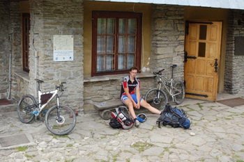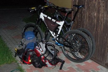 Na wysokości czerniaka rozszczelniła mi się dętka - nie chciałem jej zmieniać wiec podpompowywałem ją co jakiś czas i to był błąd- wybijanie z rytmu,do tego bolące już okrutnie tyłki i konkurs kto dłużej wytrzyma bez wstawania z siodła, chęć obrócenia spodenek na lewą stronę, po tych wszystkich perypetiach dopadła nas głupawka, Michała lekki kryzys z którym ja się uporałem pijąc litr pepsi wiezionej na czarna godzinę:). Na miejscu zobaczyli nas moi rodzice, przyzwyczajeni do widoku mnie w błocie, ale czegoś takiego to Oni jeszcze nie widzieli- zwłaszcza ze po wymyciu się byłem dalej brudny. Idziemy spać - jest 23.30 Rano budzimy się trochę wczorajsi. Myjemy rowery, suszymy wyprane ciuchy, jemy śniadanie i ruszamy w drogę. Jest bardzo późno12 Udajemy się w stronę Czech. Tam gdzie chcieliśmy przekroczyć granice nie ma przejścia...