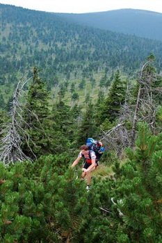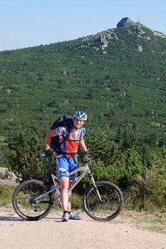 Odpowiedź na pytanie czy jedzie była natychmiastowa- jadę. Trzeba było tylko ustalić termin i mniej więcej trasę naszej wycieczki. Trasę zaprojektował Michał przy pomocy Google eartch -jechaliśmy totalnie w ciemno. Stanęło na tym że ruszamy po maratonie w Zawoji. 17 lipca o 5 rano ruszyliśmy w nasz bój. Z Czerniawy Zdrój ruszyliśmy w stronę Karkonoszy. Na dzień dobry podjazd na Stóg Izerski i powolne przyzwyczajanie się do 17 kg plecaka. Prawdziwa jazda na dziko zaczęła się dopiero od Śnieżnych Kotłów- dzika szarża w dół pustymi, pięknymi Sudeckimi szlakami była dopiero przedsmakiem tego, co nas czekało w kolejnych dniach. Nie wiem ilu ludzi zjechało bez plecaka ze Śnieżnych Kotłów do Odrodzenia i nie wiem ilu poza nami zrobiło to z plecakami- jeśli zrobił to ktoś wcześniej prosimy o kontakt ;).
