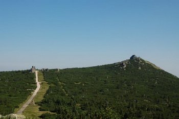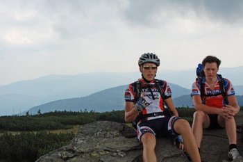 Oko cieszyły bajeczne widoki, w ich towarzystwie kilometry mijały w zawrotnym tempie, nie przeszkadzało słońce, muchy i pragnienie, podjazdy dawały naszej duszy tylko spełnienie. Rozczarował mnie za to podjazd i zjazd na Pradziada - asfalt. Zjazd w miarę szybki, ale nudny bez agrafek, na tyle nudnych że dokręcaliśmy ile wlezie i nie używaliśmy hampli. Po zjechaniu z Pradziada cały odcinek pokonaliśmy po szosie. Nuda nuda nuda. Słońce dawało znów we znaki. Tępo było bardzo szybkie- spieszyliśmy się do rowerowego, aby wstawić urwana szprychę od str trybu w rowerze Michała. Mimo naszego wysiłku nie udało się nam dotrzeć na czas - spóźniliśmy się 6 minut. Ruszyliśmy dalej w celu zrobienia jak największej ilości km. Trafiliśmy świetnie - Hospoda nocleg 150 KC pełen luxus.