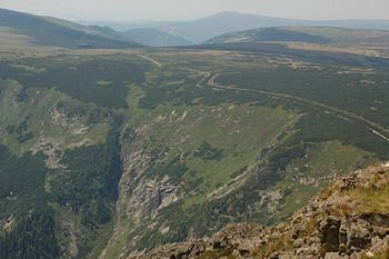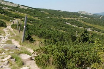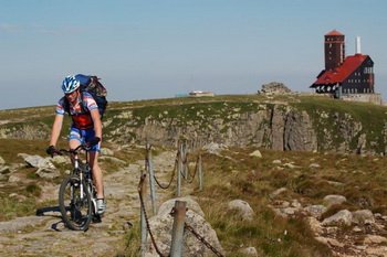 Ze Śnieżki która była mniej więcej w połowie 1 etapu ruszyliśmy w kierunku Przełęczy Okraj. Zjazd okupiony był 4 snejkami - spuszczone powietrze z opon oraz brak umiejętności odciążania roweru jadąc z plecakiem dały się nam we znaki...nie można zwalić wszystkiego na amortyzację. Aby tego było mało Michał gdzieś zgubił licznik, więc nawet nie wiedzieliśmy jakie przewyższenia pokonaliśmy danego dnia ani nie znaliśmy dystansu. Tego dnia nie mieliśmy już więcej przygód no może poza zejściem po szlaku, gdzie średnio co 20 metrów znajdował się 1,2metrowy płotek uniemożliwiający całkowicie jazdę... Po zjechaniu z wyższych partii Karkonoszy udaliśmy się w stronę gór Wałbrzyskich gdzie spaliśmy (Lubawka).