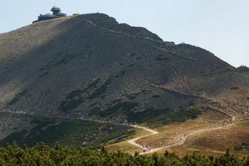 Po dojechaniu do Wielkiego stawu Michał miał 1 defekt niepoważny na szczęście. Ja odpoczywałem leżąc w kosówce i chowając się przed prażącym tego dnia słońcem. Wjazd na Królową Karkonoszy przebiegł bez problemów, spotkaliśmy się z dużym entuzjazmem ze strony turystów, dopingiem i klaskaniem. Na szczycie Ludzie nie dowierzali, że jest możliwe zdobycie szczytu rowerem...