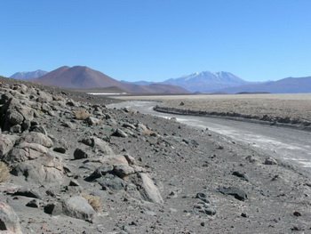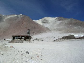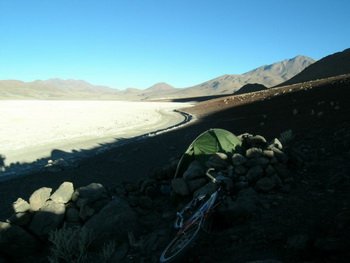 Kolejne trzy, czy cztery godziny były równie upojne, sceneria zmieniła się tylko na wyschnięte koryto rzeczne. W nocy cieplutko (-8C). Tak romantyczne przeżycia skłoniły mnie do decyzji by całą akcje przyspieszyć. Zamiast leniuchować i zrobić tylko 600 metrów przewyższenia (tak nakazuje rozsadek dla osoby niezaaklimatyzowanej) postanowiłem dołożyć te 200-300 metrów, czyli zanocować na przełęczy (około 5000 m n.p.m.). Nie bez znaczenia był tu również prawdopodobny zasięg GSM (jedna z kopalń ma większy budżet niż Ollague:)). Dzięki takiemu zabiegowi, teoretycznie mógłbym z tej bazy zaatakować Aucanquilchę.
