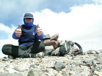 Tu mi się urwał ślad Hiszpanów, pewnie specjalnie weszli za zmarzły grunt;) Powoli odnajdywałem się w labiryncie dróg i ścieżek. Dobrą chwilę namierzałem najwyższy wierzchołek. Wolałem się nie pomylić. Bardzo dobra widoczność pozwala zachwycać się ogromem przestrzeni. Daleko w dole malutkie Campamento, dopiero wtedy uświadomiłem sobie – przecież to prawie 1000 metrów niżej. Droga, czy też cokolwiek co ją przypominało, skończyła się. Zadarłem głowę. Do szczytu zostało mi ponad 100 m w pionie. Sto metrów rumowiska skalnego. A wiaterek zaczynał dokazywać solidnie. Wyszukując większe i solidniej wyglądające odłamki starałem się wspinać. Nie dawało to specjalnych rezultatów, próbowałem innej drogi, i kolejnej. „Cholera” to nie to słowo, które gościło wtedy na moich ustach. W końcu zwierzęcy atak, do bólu w zmęczonych mięśniach, do ostatniego oddechu. Powiedziałem sobie: „Nie odpuszczę!” Gdy byłem tak blisko, gdy tyle poświęciłem by tu wrócić. No k... mać! W końcu zadziałało:) Wgramoliłem się na szczyt. Okrzyk zwycięstwa, plakietka, podpis, zdjęcia, uściski dłoni, wizyty w zakładach pracy. Udało się!!! Wiatr był tak silny, że stojąc nie byłem w stanie utrzymać równowagi. Zziębnięty ruszyłem w dół, spragniony sięgnąłem do camelbaka. Nagryzając ustnik poczułem chrzest lodu. Ups...