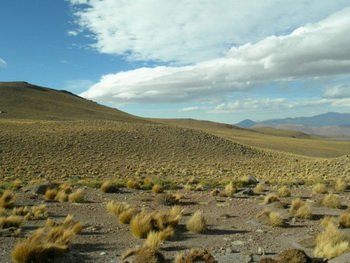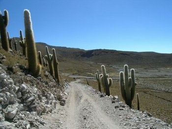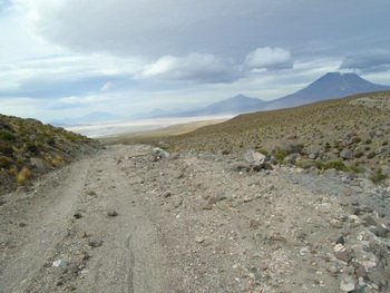 Po zdobyciu Aucanquilchy pozwoliłem sobie na dzień odpoczynku by wreszcie ta wiadomość do mnie faktycznie dotarła. Drugim powodem był oczywiście ogólny stan, delikatnie mówiąc zmęczenia. Jako następny etap zaplanowałem sobie przejażdżkę do Uyuni w Boliwii. Pierwszy dzień miał się zakończyć w San Juan gdzie wynalazłem sobie przyjemny hotelik. Po dokuczliwościach związanych z biwakowaniem na sporej wysokości postanowiłem raczej unikać namiotu. Dzień był piękny, na granicy szybko mi podbili papiren i znalazłem się w Boliwii. Zaraz za granicą wjechałem na całkiem przyzwoitą drogę i spokojnie sobie nią jechałem, aż dostrzegłem, że moim kierunkiem powinien być zachód a nie południe. Rzut oka na mapę – drogi na południe żadnej nie ma, pewnie ta jedyna tak się kreci. Mimo wszystko po chwili (andyjska chwila = bliżej nieokreślony odcinek czasu oznaczający czas do pojawienia się samochodu w zasięgu wzroku, może trwać dzień bądź dwa) zatrzymałem przejeżdżającą