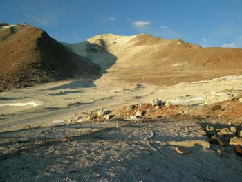 Zapomniałem napisać, że napotkani na początku wyprawy Hiszpanie mówili, że wchodzili na Aucanquilchę. Ich ślady do pewnego momentu stanowiły dla mnie cenna wskazówkę. 20 albo 30 kroków, przerwa na parę głębokich oddechów, mozolne gramolenie się coraz wyżej. Romantyzmu co nie miara. Krok za krokiem. Coraz wyżej i wyżej. Zaczynam doceniać chodzenie – jest zdecydowanie mniej wymagające niż jeżdżenie na rowerze, który do podjeżdżania wymaga jednak drogi. Chyba się starzeję;) Po czterech godzinach docieram do kopalni. Fantastyczny widok, żółte ściany, pozostałości maszyn, mnóstwo dróg, dołów, wszechobecny zapach siarki i siarkowodoru(?). Piekło?