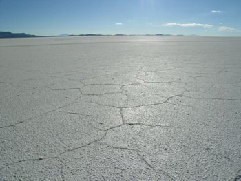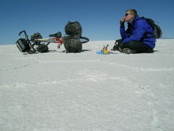 Następnego ranka czekał mnie jeszcze większy kawał salaru. Namierzyłem właściwe ślady – droga z oczywistych względów nie istnieje. Dookoła tylko biel salaru i błękit nieba… Tempo bardzo dobre, jechałem na GPS´owy namiar hotelu z soli. W trakcie zrobiłem sobie przerwę na śniadanie. Na białym stole rozłożyłem serwetkę, krakersy z mielonką, agua do popicia. Niezapomniane wrażenie nieskończonej przestrzeni.