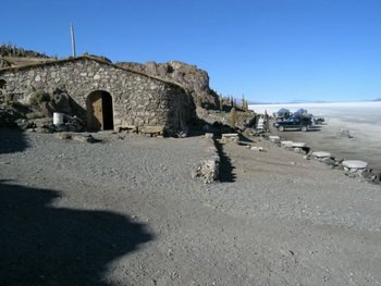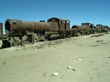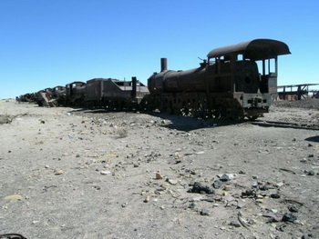 Po 14 dotarłem do hotelu, miałem ochotę go obejrzeć. Niechcący stałem się dodatkową atrakcją tego miejsca. Wiele turoperatorow wybrało to miejsce na obiad. Szybko się zmyłem, nie czekając aż dzielni turyści znajdą inny cel dla swych aparatów. Ostatnie dwadzieścia kilka kilometrów do Uyuni utwierdziło mnie tylko w słuszności dalszych planów. Sugeruję władzom wybudować jakiekolwiek drogi na tym terenie. Oczywiście wszystkie „drogi” tu są szutrowe. Myślałem, że mi tyłek odpadnie, a swoje on wytrzyma:) W końcu Uyuni. Wybrałem chyba najdroższy hotel. Recepcjonista mało nie zemdlał jak mu się wpakowałem z rowerem. Miał wyraźną nadzieję, że koszty mnie zablokują, ale ja nie mrugnąłem nawet okiem. ¨Si, si¨ rzekłem na podaną cenę. W końcu po ubiegłej nocy mi się należy. Przy każdym kroku z mojego ubrania unosiła się chmura pyłu… Z ciekawością oczekiwałem reakcji gościa, ale trzeba przyznać - ładnie „zaniewidział”. Przepięknie, bardzo klimatycznie urządzony hotel, tak różny od europejskich sieci. Miałem spędzić tam praktycznie trzy dni. W planach miałem cmentarzysko pociągów, sprawdzenie lokalnych specjałów, może pamiątki…