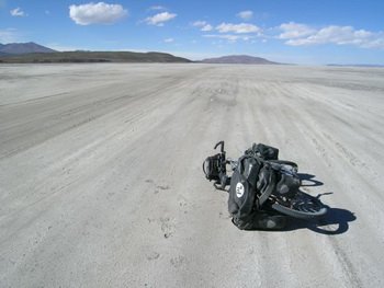 Po ponad dwóch godzinach byłem na dole. Szybkie pakowanie i do cywilizacji. Hahaha! Znaczy do Ollague. Byłem bardzo zmęczony, ruchy były powolne, jakby w zwolnionym tempie. Wiatr wiał w dobrą stronę... Ruszam. O jedno dobrodziejstwo za dużo. Porywisty wiatr i z górki, z trudem panowałem nad rowerem. Czekało mnie czterdzieści kilometrów zjazdu. Normalnie ekstra zabawa, ale nie gdy człowiek się ledwie kupy trzyma. Nie miałem wystarczająco dużo siły by właściwie kontrolować hamulce. Działem tylko 0-1, albo hamowałem, albo zupełnie nie. Najpierw stosowałem 0. Szybka gleba. Otrzepałem się, przeanalizowałem sytuację. Ok. Hamulce się przydają. Dzięki temu kolejna wywrotka przytrafiła się dopiero pod koniec.