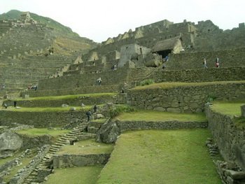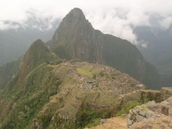 Skłamałbym gdybym powiedział, że powaliło mnie na kolana. Chyba tak nienawidzę turystycznego tłumu, że przysłonił mi piękno tego miejsca. Faktycznie chyba najlepszym pomysłem na zwiedzanie jest opcja, którą wybrał jeden z moich wyprawowych przyjaciół, czyli wyruszenie w górę rankiem, przed całą nawałnica turystów, którzy pojawiają się wraz z pierwszym pociągiem z Cuzco. Ze względu na porażającą szybkość wypisywania biletów nie udało mi się złapać pierwszego pociągu i dopiero następnym dotarłem do Aguas Calientes. Trzeba było jeszcze kupić bilet na wejście (trzeba kupić w wiosce, nie można w Machu - kolejny idiotyzm), za drobne 40$. Potem jeszcze bilet na autobus. I w końcu byłem na górze. Szkoda, że wszędzie tylu ludzi. Najgłośniejsza była zresztą polska grupa. Na początek ruszyłem do Inkaskiego mostu. Praktycznie niezabezpieczona ścieżka nad przepaścią zrobiła na mnie niezłe wrażenie. Nastrój popsuł padający deszcz, który na szczęście po południu przestał dokuczać. Dłuższy czas szukałem sobie spokojnego miejsca, by w nieco pochłonąć atmosferę tego miejsca. Udało się dopiero przy posterunku kontrolnym Waynacośtam. Było za późno żeby się przejść do ruin na szczycie sąsiedniej góry. Zawróciłem, by poszwędać się po okolicach głównego placu.