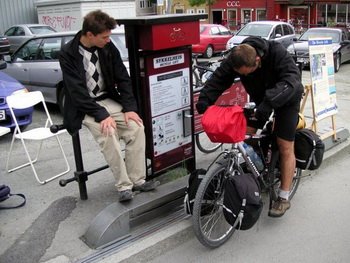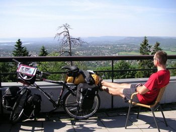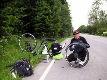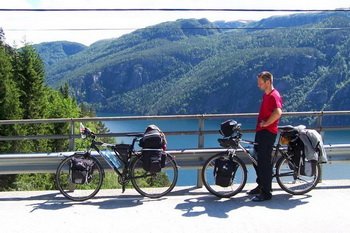 No i zaczęło się… Mozolnie wpychamy rowery na skalną ścianę po drugiej stronie jeziora Bandak. Ponieważ po drugiej stronie zaczynało się pasmo górskie musieliśmy pchać nasze rowery dłużej niż początkowo przypuszczaliśmy. Na noc zatrzymaliśmy się koło samotnie stojącej chaty. Zrobiło się naprawdę zimno, tak, że w namiocie ogrzewaliśmy się kuchnią gazową. Rano- po tym jak lekko poprószył śnieg - czym prędzej i bez śniadania odjechaliśmy z tego miejsca. Podczas jazdy jest jednak cieplej…