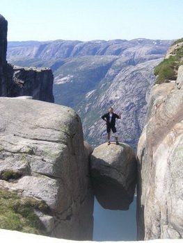 Opuszczamy w końcu to nieprzyjazne pasmo górskie i docieramy do pierwszego fiordu na naszej trasie – Lysefjord. Parkujemy przy położonym nad urwiskiem schronisku Øygardstøl i ruszamy na dwugodzinną pieszą wspinaczkę na Kieragbolten. Zawieszony na 1138m.n.p.m. pomiędzy dwiema skalnymi ścianami kamień – jedna z największych atrakcji tego fiordu. Miejsce popularne również wśród uprawiających BASE jumping. Niestety tego dnia pomimo dobrej pogody nikt nie skakał. Na dole, na kempingu Lysebotn, który jest bazą wypadową dla miłośników tego ekstremalnego sportu obejrzeliśmy film nakręcony podczas skoków.