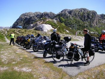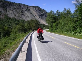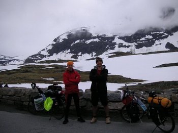Następnego dnia na trasie spotykamy dwoje Australijczyków jadących na rowerach z Nordkapp. Wymieniamy się informacjami o trasie. Ostrzegają nas przed bardzo długim i stromym podjazdem. Droga wije się serpentynami po zboczu góry. Wspinamy się mozolnie wzbudzając zdziwienie i podziw u mijających nas innych turystów w samochodach i autokarach. Trąbią i pozdrawiają nas z okien, niektórzy nawet robią nam zdjęcia. Podjazd kończy się na wysokości 1100m. Po kilku kilometrach trafiamy na ponad ośmiokilometrowy zjazd do Vik.