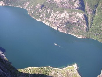 Kolejny dzień to przeprawa promem wzdłuż fiordu. Przez godzinę podziwiamy to, co już wcześniej widzieliśmy z góry. Na drugim końcu znajduje się Prekestolen – półka skalna zawieszona 600m nad wodą. Miejsce bardzo popularne. Jednak z powodu kiepskiej pogody i słabej widoczności rezygnujemy z wejścia i jedziemy dalej. Tym razem przez kilka dni przerabiać będziemy jazdę w deszczu.