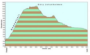 Podjazd zaczyna się ok. 500 metrów od kempingu. Około 15 kilometrów drogi pokonujemy w niecałe cztery godziny jadąc z ok. -34 na 1400m.n.p.m. Jest to pasmo górskie Sognefiell w górach Jotunheimen. Jest pochmurno i mgliście. Momentami pada deszcz. Niestety z napotkanych na trasie punktów widokowych nie wiele widać. Niejednokrotnie jesteśmy pozdrawiani i dopingowani, co jest miłym akcentem na ciężkiej trasie. Na górze turyści z Niemiec w wozie kempingowym częstują nas kawą. Na pułapie 1400m robimy jeszcze kilka kilometrów zatrzymując się po drodze w schronisku zimowym. Mamy możliwość skorzystać z Internetu. Jadąc w kierunku Lom mamy kilka długich zjazdów. Pada coraz mocniej. Około 10km za Lom znajdujemy kemping i nocujemy tym razem w domku.