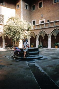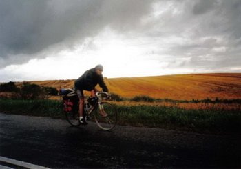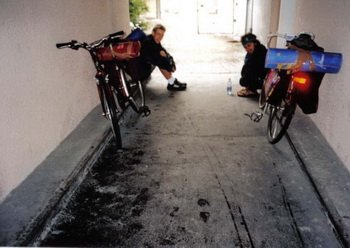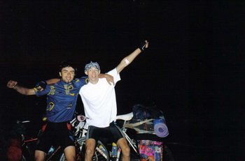 O tej porze nie było tam nikogo prócz nas i naszych rowerów :-D Jechaliśmy jeszcze tym lasem ok. 3-4 km. Przejechaliśmy centrum Polski czyli miasto Koło, następnie kolejno Sompolno, Piotrków Kujawski. Ta trasa była rewelacyjna. Idealnie prosta droga, równiutki dywanik asfaltu co nas dziwi... Na polskich drogach taki luksus? :-) Na dodatek sprzyjał nam silny wiatr. Idealnie wiał nam w plecy. :-) Dojechaliśmy do Kruszwicy. Gdy siedzieliśmy na ławce na rynku podszedł do nas pewien facet z mikrofonem :-) Okazało się że jest z lokalnego radia i szuka jak sam oznajmił "wariatów i zapaleńców takich jak my" :-) zrobiło się miło.... :-) Udzieliliśmy wywiadu, który ponoć miał być emitowany w lokalnym radiu (Radio Pomorza i Kujaw) i w I Programie Polskiego Radia :D Po czym rozpadało się ... :/ Padało tak przez ponad 3 godziny. Koczowaliśmy w jakiejś wiacie, przejściu pomiędzy kamienicami wokół rynku. W między czasie przygotowaliśmy rowery do jazdy w deszczu, osłoniliśmy sakwy workami by nie zmoczyć bagażu. Nasze sakwy nie gwarantowały wodoszczelności... Sprawiliśmy sobie też odlotowe pokrowce na buty by je nie przemoczyć.. ale to już inna historia... :D Kiedy deszcz ustał na chwilkę, próbowaliśmy kontynuować dalszą jazdę lecz po 1km. skończyło się to przymusowym zjazdem na parking tirów oczekujących na wjazd do fabryki produkującej olej rzepakowy. Wypiliśmy tam ciepłą herbatę. Chłopcy wozili rzepak z pobliskich miejscowości. Siedząc tam otrzymaliśmy propozycje... Mianowicie by nas podrzucić przynajmniej kawałek. Czy, aż tak źle wyglądaliśmy? :-) Na "pace" Tira znalazły się nasze rowery. Ja w jednym tirze (Man) , Łukasz w drugim (Jelcz :-D) i tak podjechaliśmy w tym deszczu może z 20 - 30 km aż pogoda się poprawiła i kontynuowaliśmy jazdę: Inowrocław - Bydgoszcz - Koronowo - Mąkowarsko - Tuchola, gdzie dojechaliśmy późnym wieczorem. Okazało się że problemy z noclegiem nie skończyły się na dniu poprzednim. Po godzinie poszukiwań znalazła się pewna pani, która użyczyła nam podwórka :-) praktycznie w środku miasta, ale grunt by mieć gdzie spać :-) Tego dnia okazało się że mamy oboje lekkie odwodnienie pomimo, że piliśmy dziennie ok. 10 butelek wody 1,5 l. Dostaliśmy sporej gorączki (ponad 40 °C), ale do rana wykurowaliśmy się masą tabletek i litrami wody myśląc, że to przeziębienie :-) Usnęliśmy ok.23:00. 4 Dzień (Sobota, 14 VIII 2004) Przez gorączkę wstaliśmy nieco później bo ok. 06:00 lecz pogoda była beznadziejna, deszcz, wiatr ... ok. 09:00 wyjechaliśmy w tej niepewnej pogodzie w dalszą trasę. Niestety Łukaszowi rozsypały się rączki na kierownicy, przez co później stracił czucie w dwóch palcach u ręki :/ (nie na długo :-) ). Kupiliśmy więc zwykłą gąbkę do mycia koloru różowego :D. Rozciąłem ją i taśmą klejącą przymocowaliśmy to na jego kierownicy. Ponoć jeździło mu się bardzo komfortowo... :D Dzień rozpoczęliśmy od przejazdu przez "Bory Tucholskie". Polecam wszystkim te tereny! :-) Po prostu super krajobrazy... i ten zapach... :-)