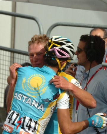 Vinokourov odbiera gratulacje od Alberto Contadora